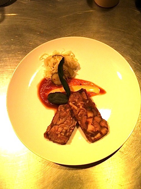 In my earlier post about the pig I promised a head cheese starter, which is now on the menu as a “Pig’s head terrine”. It is served with our apple butter, homemade honey mustard, and a salad of shaved cabbage and homemade pickles. The dish is garnished with fried sage, and is certainly eye-catching: