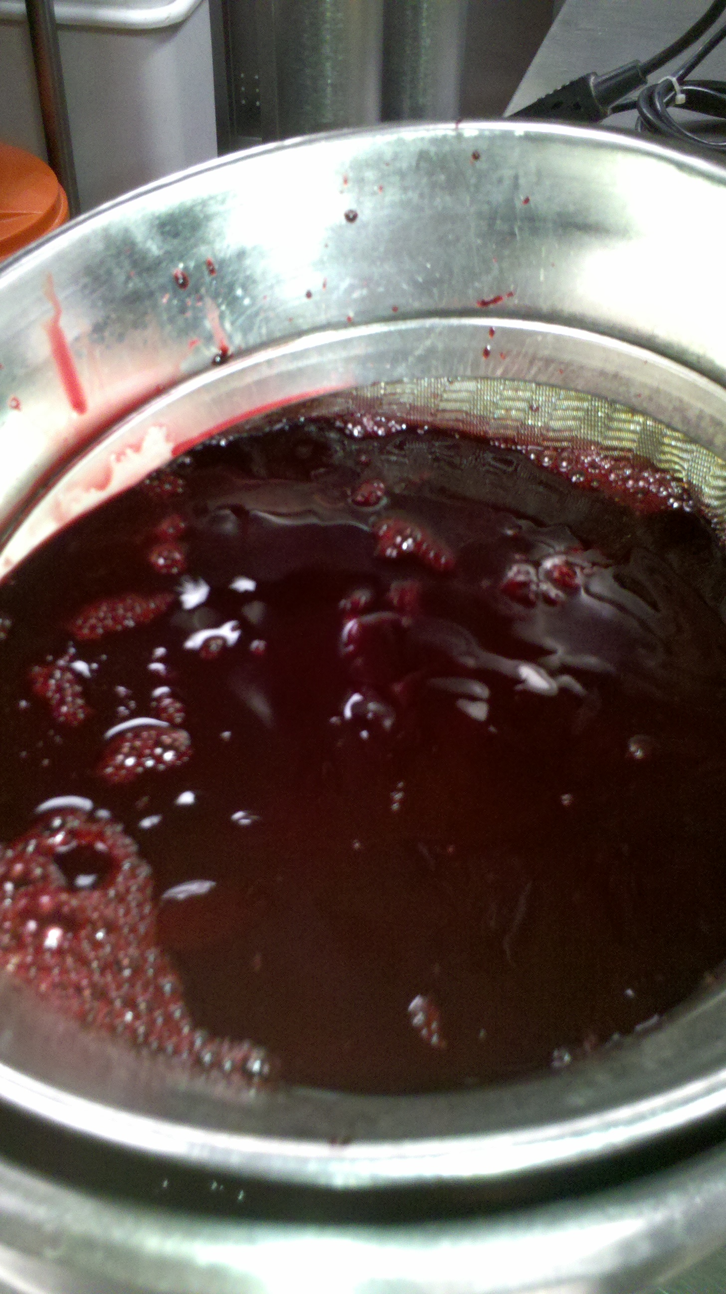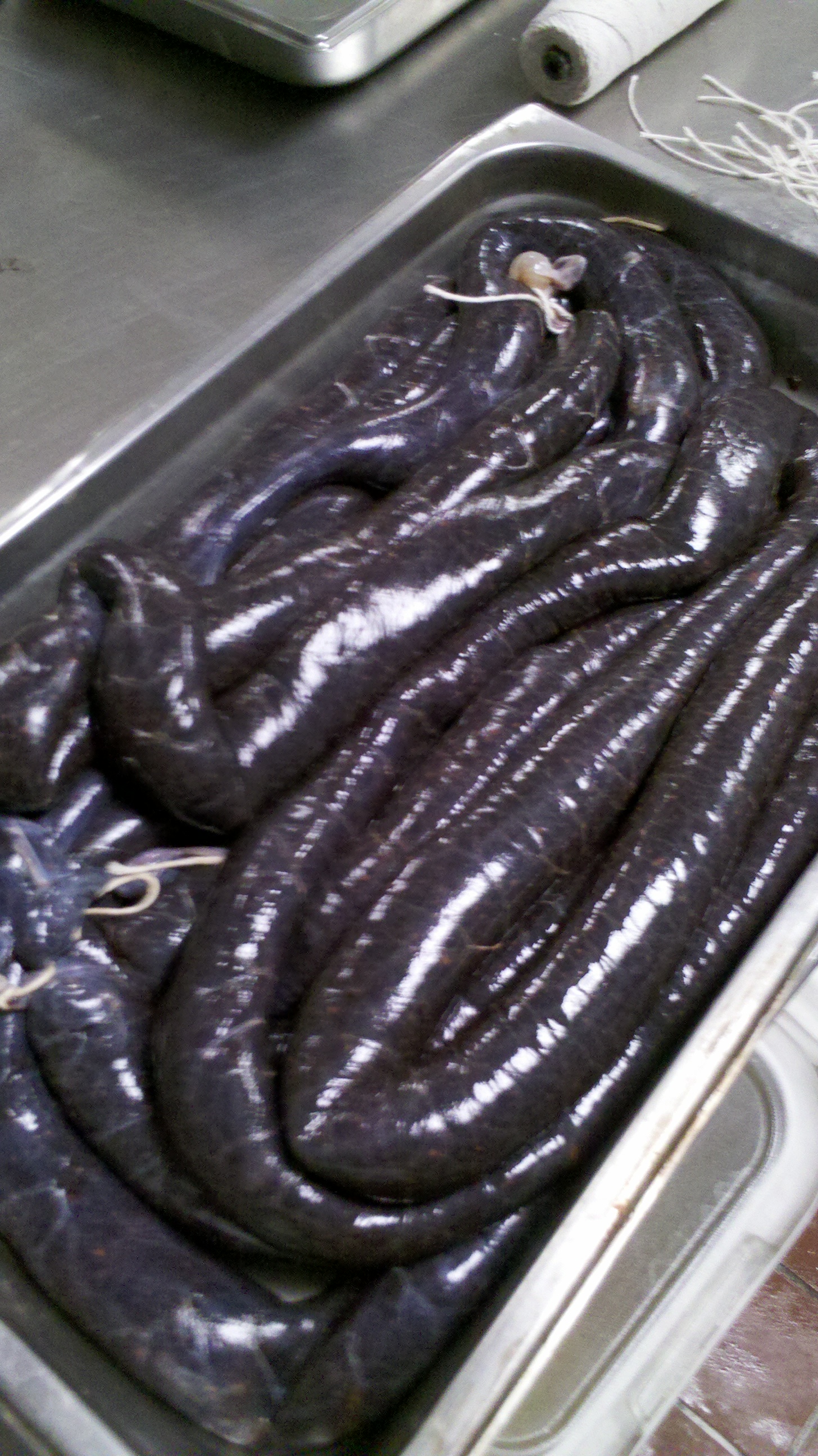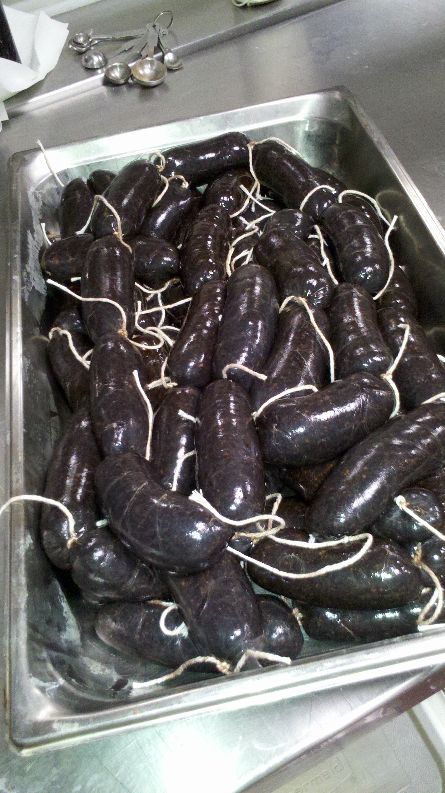 The photos are in succession starting with the blood being strained, then the sausage mix(blood, meat, fat and spices), next the sausage mix is filled into casings, followed by tied into links, then being poached and finally seared, on a plate moments before we ate them.