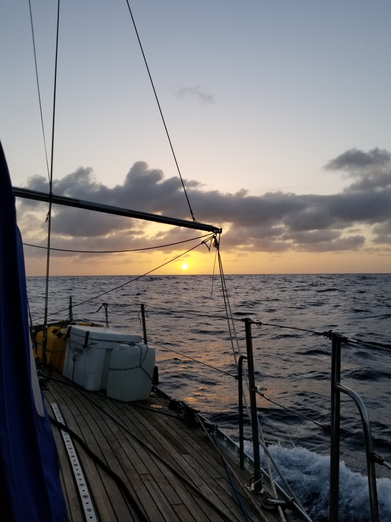 At sun up we shook out the reefs in the main, going from double reefed to full main. Avocet is equipped with the ability to put three reefs in the main, making it smaller or larger to adjust for different wind conditions. With a little bit more wind in the air, we also pulled out the jib. There was enough wind to fill the sails, but not enough to power Avocet more than 3 knots, so we kept the motor running, pushing us along at close to 6 knots.
