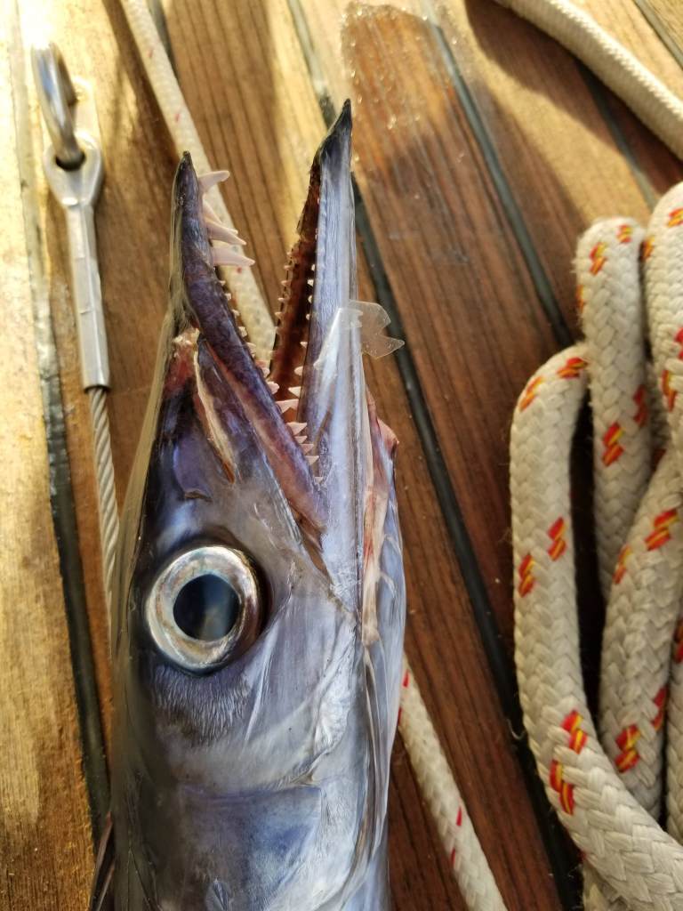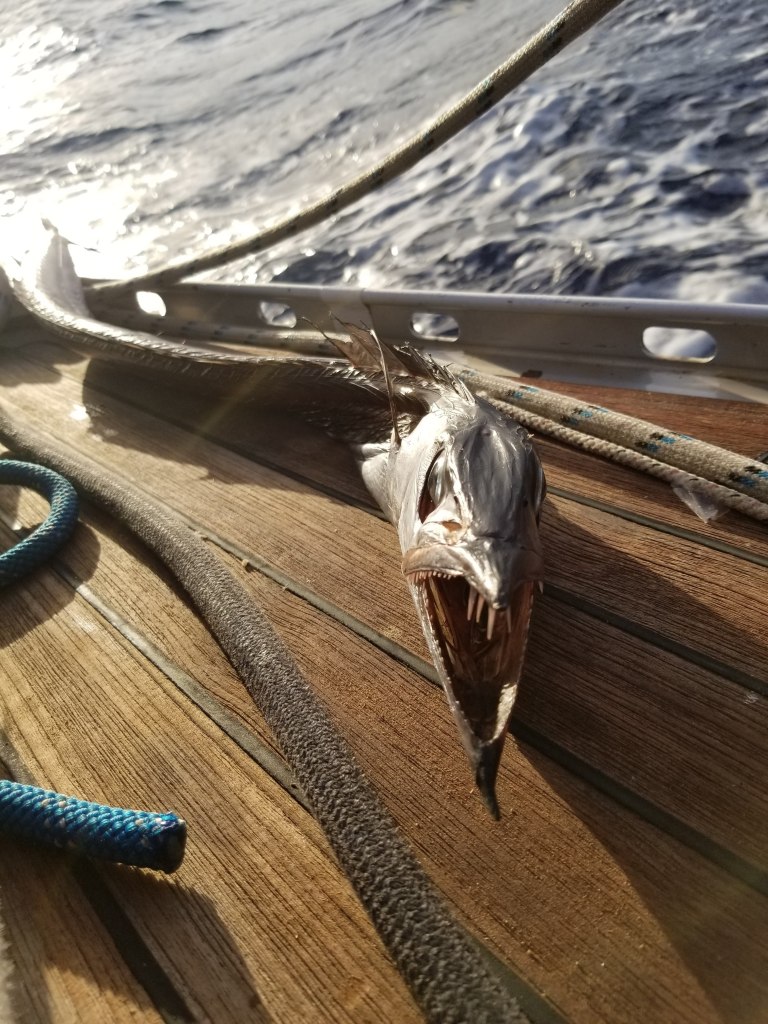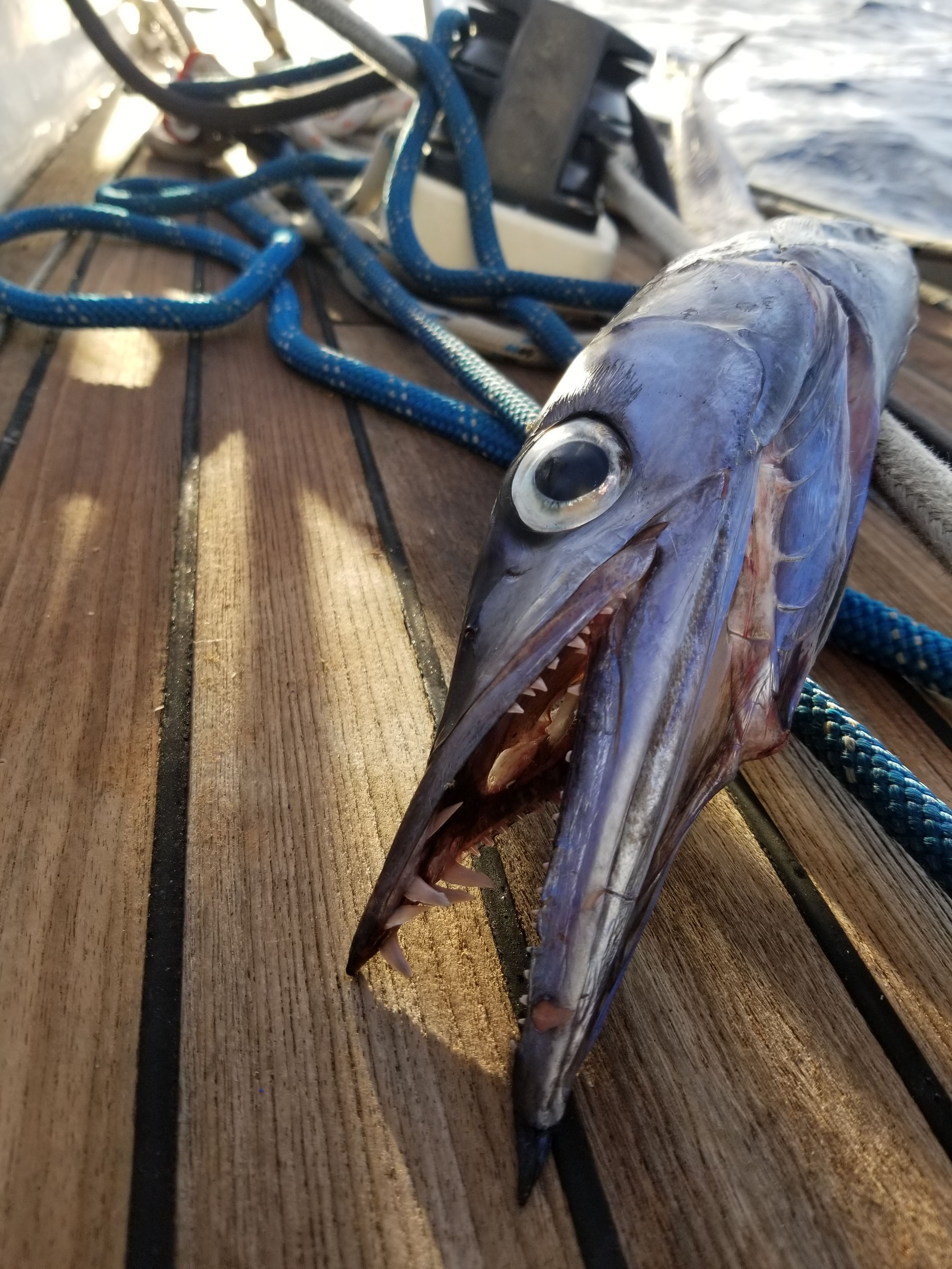 Just after dinner last night we realized that the fishing line was still out. Dennis reeled it in, noticing as he was pulling the last of the line that there was a fish on the line. It was about 3 ft long with an eel like dark body, a regular fish tail, not an eel tail, huge eyes, and a set of pointy sharp teeth that would make any yippy rat-dog owner proud. None of us knew what it was, so we didn’t want to eat it. Since it was already dead we just left it at the toe-rail until this morning, at which point I took some photos and set it back into the sea from which it came.