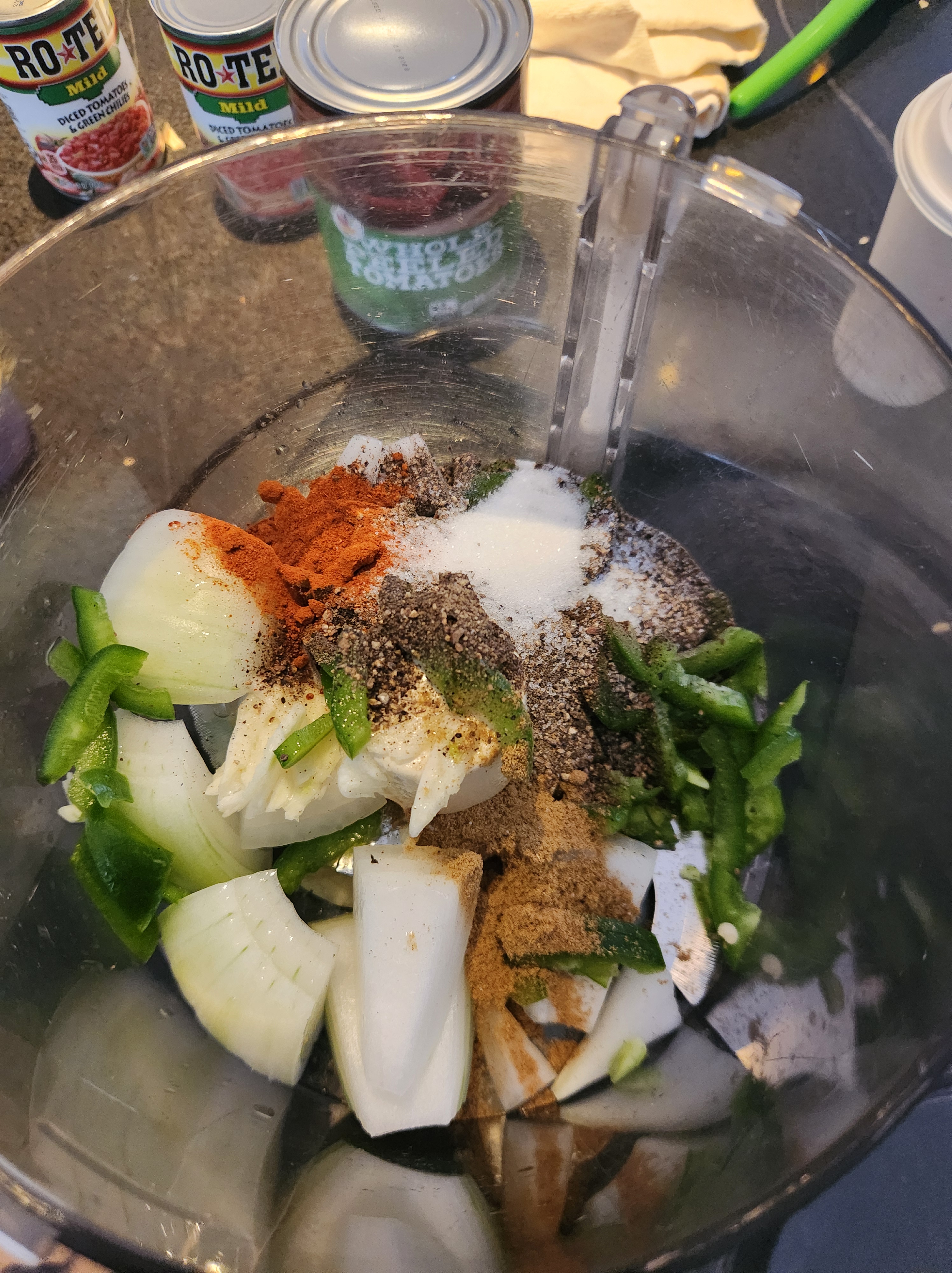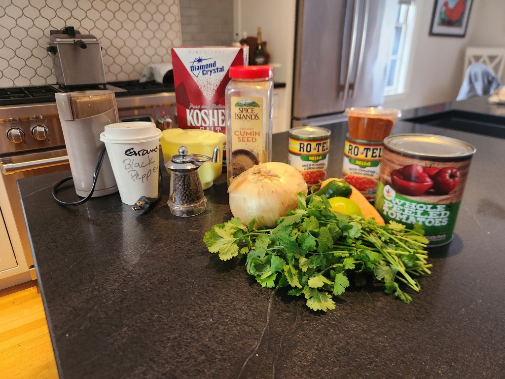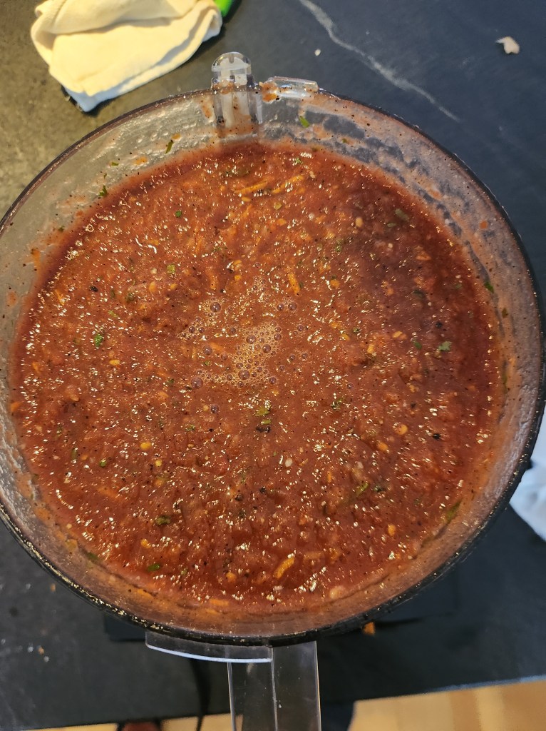 Dan found this recipe online about 25 years ago, it is called “Restaurant Style Salsa”. It is very simple to make, as is my version, really just chop a bunch of ingredients in a food processer for less than a minute and your done.