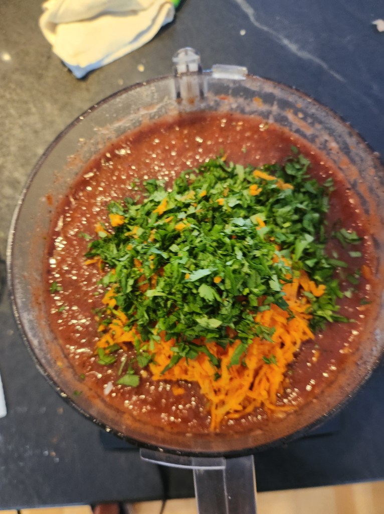 My “go to” version of this recipe is the recipe that Dan gave me all pumped up. I double the amount of onion and garlic called for in the original recipe. I’ve also at least quadrupled the amounts of all of the spices. And I’ve also added a few ingredients to my version including a very generous amount of freshly ground black pepper, some finely grated carrot, which I love in this recipe, it adds color, texture, sweetness and earthy carrot-ness. On top of that I’ve also added smoked paprika, this adds some deep background smokiness without overpowering the other ingredients.